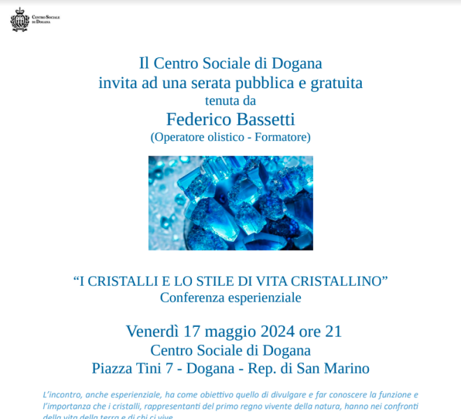 Venerdì 17 Maggio alle ore 21,00 presso il Centro Sociale di Dogana, si svolgerà una serata pubblica e gratuita tenuta da Federico Bassetti (Operatore olistico e Formatore) e intitolata “I cristalli e lo stile di vita cristallino”.