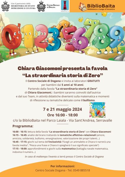 Martedì 7 e martedì 21 maggio alle ore 16:00 presso la BiblioBaita, la piccola Biblioteca nel Parco Laiala di Serravalle, si svolgeranno due laboratori gratuiti per bambini dai 5 ai 10 anni promossi dal Centro Sociale di Dogana in collaborazione con la Giunta di Castello di Serravalle e con il Patrocinio della Segreteria di Stato Istruzione e Cultura. La professoressa Chiara Giacomoni autrice del libro “LA STRAORDINARIA STORIA DI ZERO” insieme al suo Team coinvolgerà i bambini in attività didattiche divertenti sulla matematica e in momenti di riflessione su tematiche delicate come il bullismo. In caso di maltempo l’evento si terrà presso il Centro Sociale di Dogana in piazza Tini n. 7 Per info: Centro Sociale di Dogana – tel. n. 0549 885518