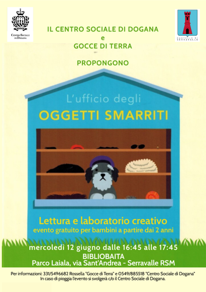 Mercoledì 12 giugno dalle ore 16,45 alle ore 17,45 presso la BiblioBaita, la piccola Biblioteca nel Parco Laiala di Serravalle, si svolgerà un laboratorio creativo e gratuito per bambini (a partire dai 2 anni) intitolato “l’Ufficio degli oggetti smarriti”, laboratorio organizzato e promosso dal Centro Sociale di Dogana e dall’associazione “Gocce di terra”. In caso di pioggia l’evento si terrà presso il Centro Sociale di Dogana in piazza Tini n. 7 Per info: Rossella tel n. 331 5496682 (Associazione “Gocce di terra”) – Centro Sociale di Dogana tel. n. 0549 885518