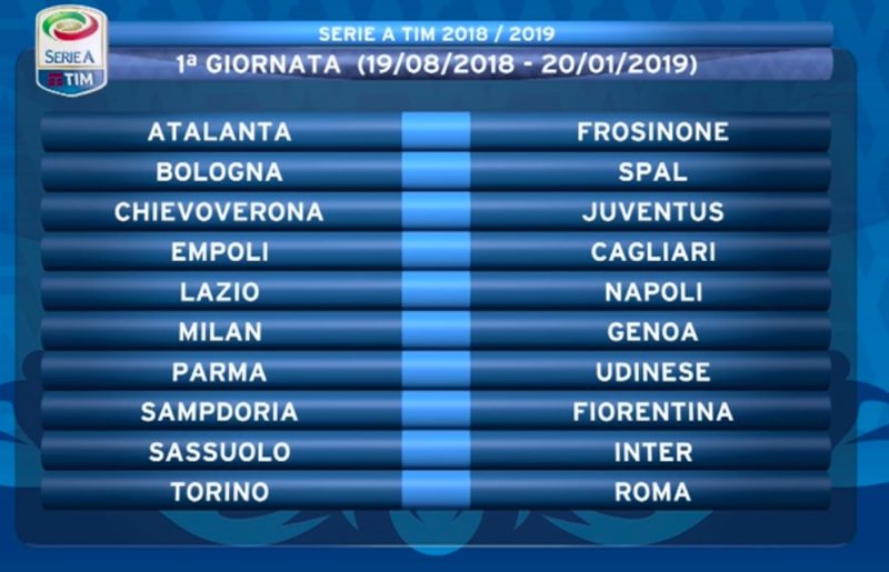 Ecco la Serie A 2018/19. Alle 19 di oggi è stato varato il calendario del nuovo campionato, che prenderà il via il prossimo 19 agosto e si concluderà il 26 maggio 2019. Ogni turno verrà spalmato su tre giorni (il sabato si giocherà una partita alle 15, una alle 18 e una alle 20.30, la domenica una alle 12.30, tre alle 15, una alle 18 e una alle 20.30, il lunedì una alle 20.30).