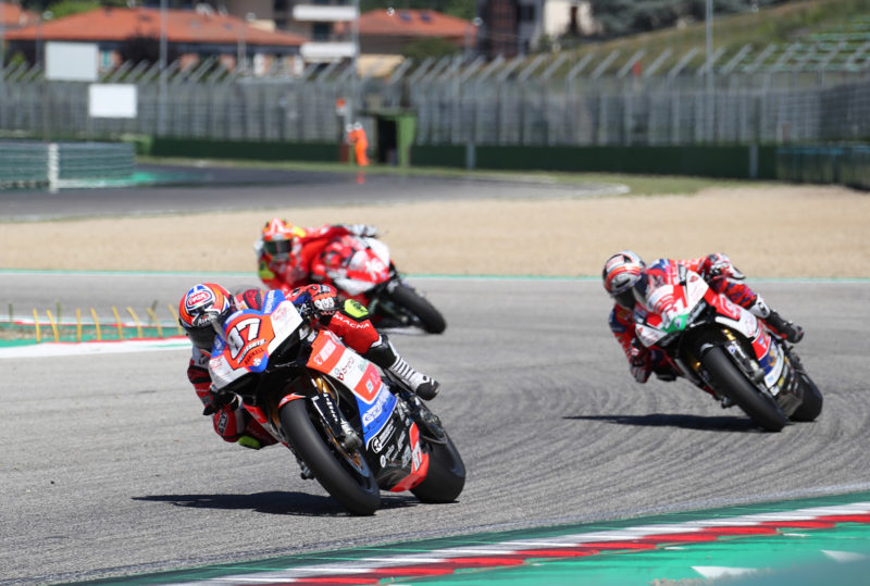 Preziosa e meritata vittoria di Lorenzo Zanetti (Ducati) nella Gara 1 SBK. Il pilota bresciano ha messo in scena l’annunciato duello con Michele Pirro (Ducati), fatto di sorpassi e controsorpassi, lanciando l’attacco decisivo a quattro giri dalla fine. Il collaudatore Ducati MotoGp ha provato a replicare con il giro veloce della gara ma alla fine si è dovuto arrendere, pagando anche le non perfette condizioni fisiche dovute alla caduta del Mugello. Ottimo il terzo posto di Matteo Ferrari (Ducati), che è riuscito ad avere la meglio nell’ultimo giro nei confronti del compagno di team Samuele Cavalieri. Ritirato per un problema tecnico al terzo giro uno degli attesi protagonisti, Alessandro Del Bianco (BMW).