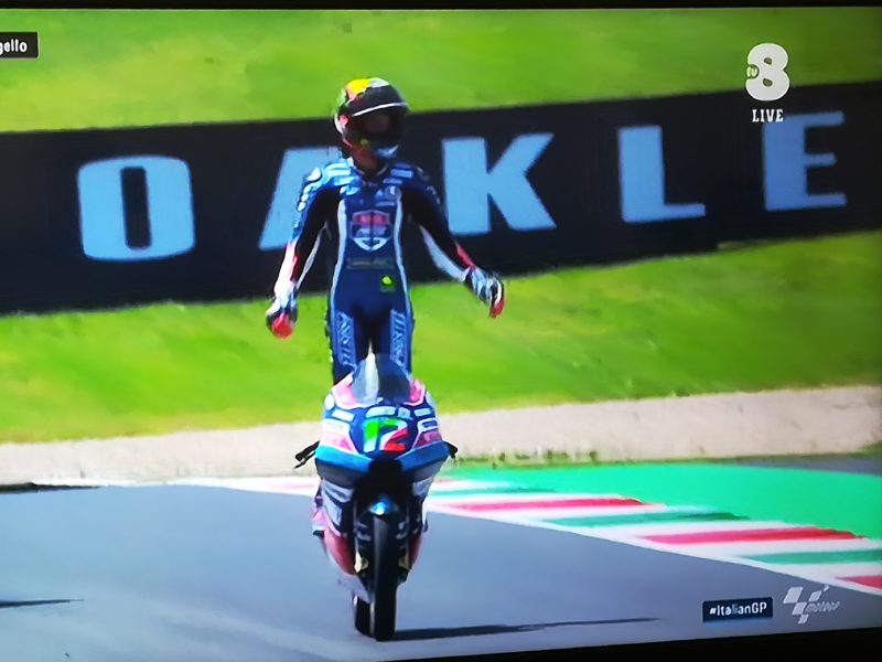 Arrivo in volata, Bezzecchi ci prova, ma Jorge Martin tiene ed è primo per 19 millesimi, 3° Di Giannantonio. Grande risultato del Team faentino di Fausto Gresini, 1° e 3°. Due riminesi sul podio, con Marco Bezzecchi ancora leader del mondiale con 3 punti su Martin. Dietro, preceduti da Rodrigo, una fila di italiani con Andrea Migno 5°, Enea Bastianini 6°, poi Arbolino, Dalla Porta, Antonelli, Pagliani, 8 italiani, 5 riminesi nei primi 10! Grande Italia, enorme Rimini !