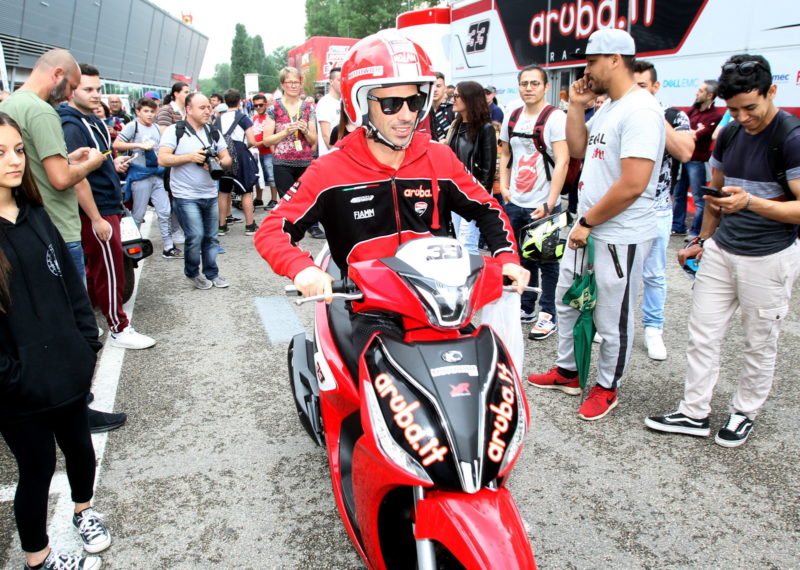 Marco Meladri è pronto. Il ravennate reduce da un inizio di stagione forse più complicato del previsto è pronto per una grande prova in Superbike a Imola. Al paddock attorniato da tanti fans di casa, nella foto Sanna con lo scooter.