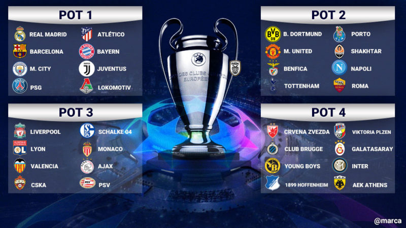 Le squadre rimaste in lizza erano 32 e il regolamento Uefa le ha divise in quattro fasce. In ogni girone è finita una squadra per ciascuna fascia. La Fascia 1 era composta dalla squadra campione in carica (Real Madrid), dalla vincitrice della UEFA Europa League (Atletico Madrid) e dalle vincitrici del campionato nelle sei nazioni con il ranking più alto. Le fasce dalla 2 alla 4 erano determinate dal ranking per club. La cerimonia è andata via liscia con un bel ritmo.