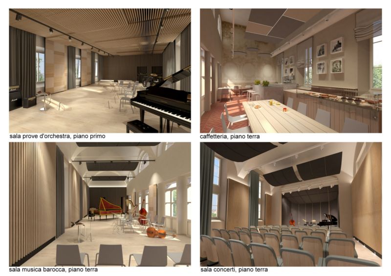 Al piano terra. La presenza dell’ampio cortile interno suggerisce la possibilità di uso ed allestimento per eventi e prove d’orchestra occasionalmente aperti ad ospiti esterni. Il portico perimetrale continuo e i numerosi affacci dei locali al piano terra ne rendono ottimale l’utilizzo, anche per comparti, fornendo diretta percezione delle attività svolte all’interno dei locali, in occasione di apertura al pubblico. L’inserimento di un locale Caffetteria al piano terra, potrebbe completare il servizio all’utenza in considerazione della attuale frequentazione dei corsi da parte di studenti fuorisede, di visitatori ed ospiti esterni ed accompagnatori degli allievi di minore età. Il cortile secondario potrebbe costituire area esterna della Caffetteria, ovvero area ricreativa/studio/sosta all’aperto. L’area Amministrativa, compresa la Direzione e la Presidenza, trovano adeguata collocazione nei locali precedentemente occupati dalla Amministrazione e dalla Biblioteca Universitaria. L’ampio Atrio a doppia altezza, voltato con crociere, collocato a cerniera tra l’ala nord e l’ala est, presenta peculiari caratteristiche valorizzabili con l’utilizzo del locale come punto Informazioni ed accoglienza dell’Utenza. La collocazione delle aule di musica di insieme, jazz e percussioni, è proposta al piano terra, nell’ala sud rivolta verso vicolo Pasolini. La posizione risulterebbe strategica sia per la possibilità di renderne compartimentato e autonomo l’accesso, anche in orari diversi rispetto a quelli previsti per l’uso delle aule didattiche al piano primo, sia per la particolare conformazione costruttiva dei locali. Le spesse murature perimetrali in parte già favoriscono il contenimento acustico, che dovrà essere ulteriormente incrementato con opportune mitigazioni, atte a costituire efficace “contenimento” verso l’esterno. L’attuale Aula Magna si presta all’utilizzo come sala concerti, con capienza per circa 100 persone.