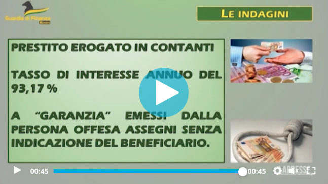 I Finanzieri del Comando Provinciale della Guardia di Finanza di Rimini hanno dato esecuzione ad un Decreto di sequestro preventivo del Giudice per le Indagini Preliminari del Tribunale di Rimini, su richiesta della locale Procura della Repubblica, a carico di un pluripregiudicato (già condannato per bancarotta fraudolenta, truffa, commercio di prodotti contraffatti, furto e ricettazione), per la ritenuta sussistenza dei reati di usura ed abusiva attività finanziaria. L’indagato avrebbe effettuato prestiti di denaro ad un imprenditore della provincia in forte difficoltà economica, applicando un tasso di interesse annuo del 93,17%, di gran lunga superiore a quelli previsti dalla Legge. Nel corso delle indagini sono stati sequestrati 12 assegni in bianco dell’importo complessivo di 79 mila euro e documentazione riportante la contabilità delle somme prestate, con il nominativo della presunta vittima ed i relativi piani di ammortamento. Video al link: https://www.lapresse.it/cronaca/2024/02/26/rimini-prestava-denaro-a-tassi-usurari-sequestro-beni-per-79mila-euro/